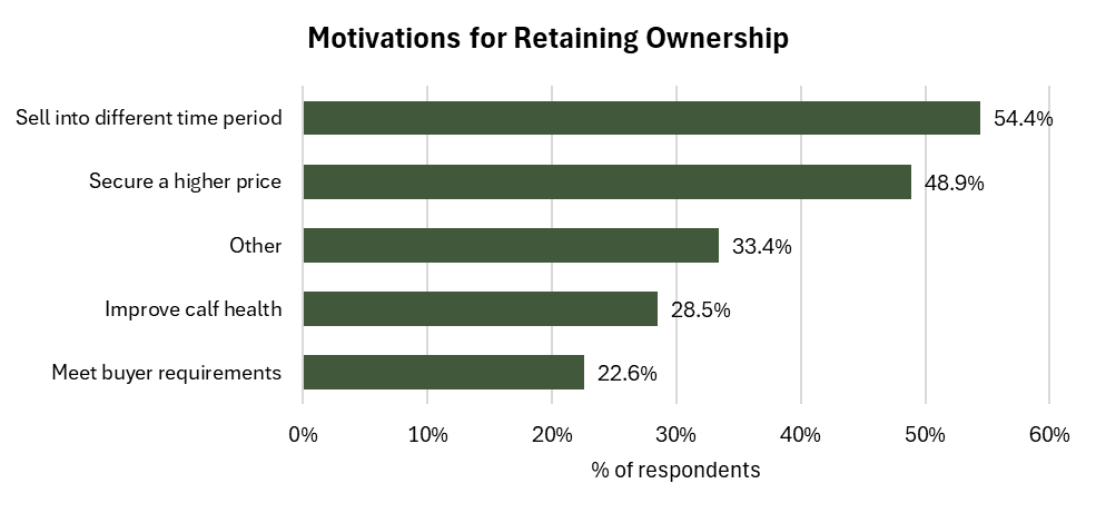 Canadian producers retain calves to sell them at a different time and higher weight, secure higher prices, improve calf health outcomes, meet buyer requirements or to reach different markets. Producers may also retain calves for operational purposes such as increasing the herd size, more effectively utilizing existing pasture, capturing manure from calves or collecting information to closely monitor genetic changes made to the cow herd.