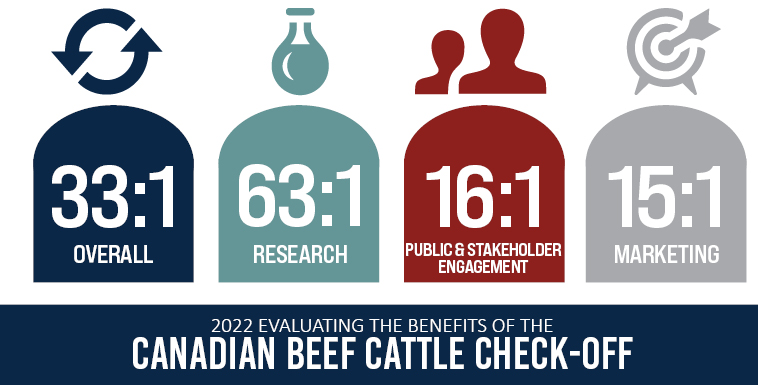 An independent study evaluating economic benefits from the Canadian Beef Cattle Check-Off shows that the producer-funded research activities deliver an extremely high return on investment. The most recent benefit-cost ratio study showed Canadian cattle producers earned $63 with every national check-off dollar invested in research, compared to $34.50 and $46 in previous studies (Rude, 2011/12 to 2013/14, and Cranfield, 2005 to 2008). Historical studies only evaluated carcass weight, while this study added more indicators. Learn more about the study and methodology.