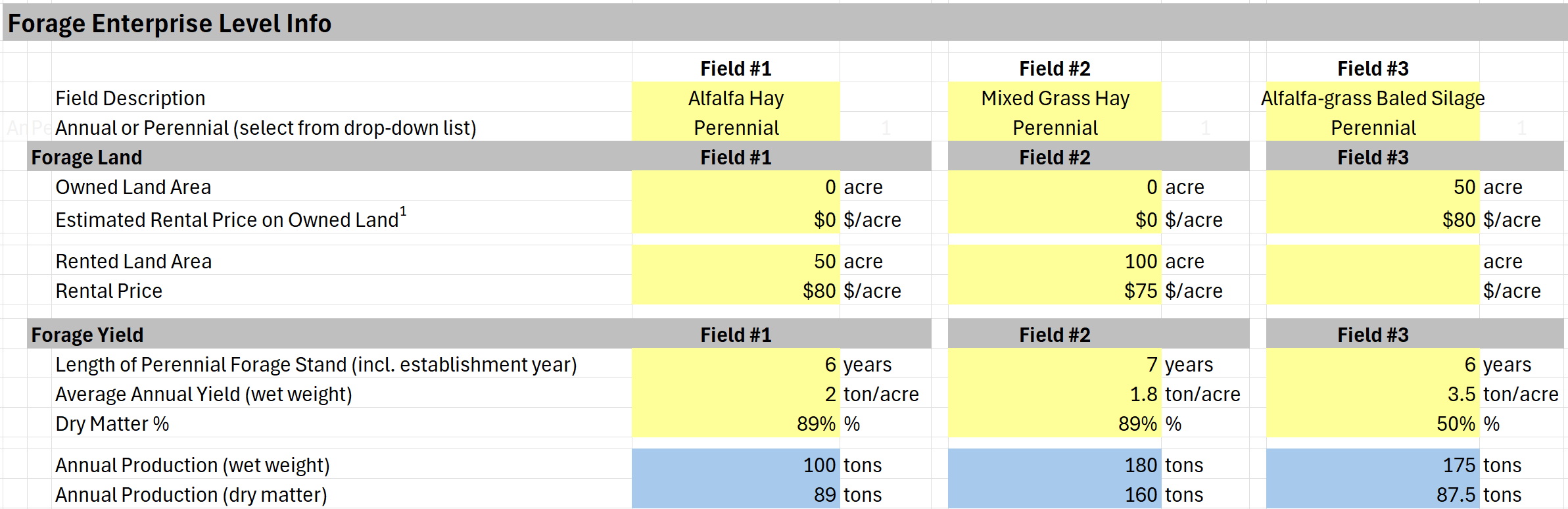 By inputting specific parameters such as acreage, yield and inputs for a particular forage crop, as well as overhead costs in cash, machinery, building depreciation and labor costs, producers can estimate production costs for existing fields.