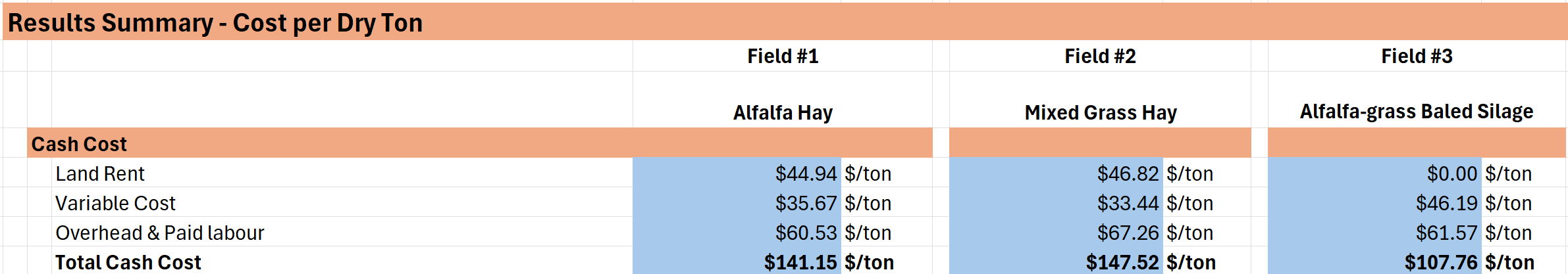 It is worth noting that although Field #1 (alfalfa hay) has the highest cash cost per acre, its cost per ton is lower than that of Field #2 (mixed grass hay). While Field #1 has the higher cost per acre due to higher seed and fertilizer expenses during the establishment year, the higher yield per acre plays a crucial role in reducing production costs on a per ton basis. This highlights how yield advantage can lead to a lower cost per ton, despite a higher cost per acre.