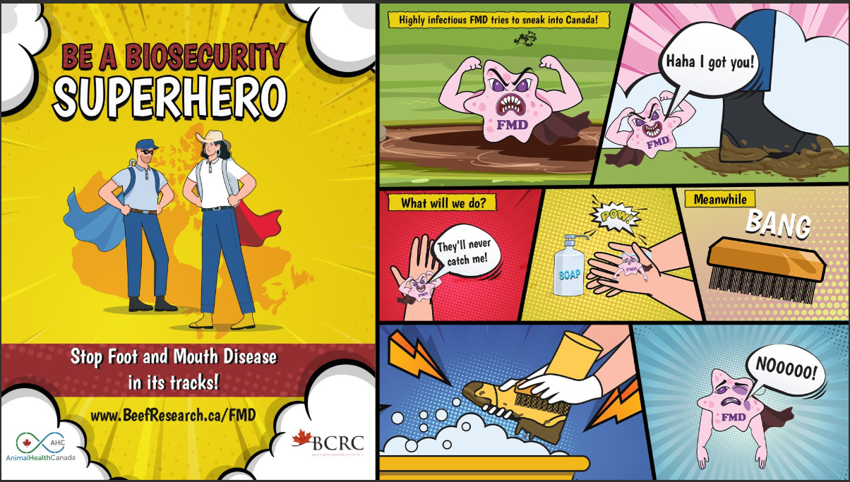 Beef producers feel the responsibility of keeping their herds and those in contact with their cattle safe, and they appreciate practical tools that support their disease prevention practices. When it comes to biosecurity practices on beef cattle operations, limiting hazards and appropriately responding with good management are key in disease prevention. These practices ultimately protect the herd and the Canadian livestock industry from the animal health and economic impacts of foreign animal diseases, including Foot and Mouth Disease (FMD).