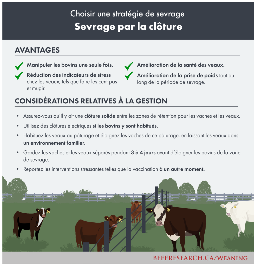 Le sevrage traditionnel (abrupt), le sevrage par la clôture et le sevrage en deux étapes sont les méthodes de sevrage les plus populaires au Canada. Chacune présente des avantages et des inconvénients différents en termes de main-d’œuvre nécessaire, de stress et de santé des veaux.