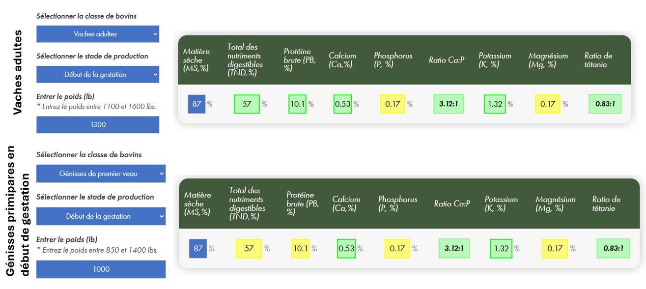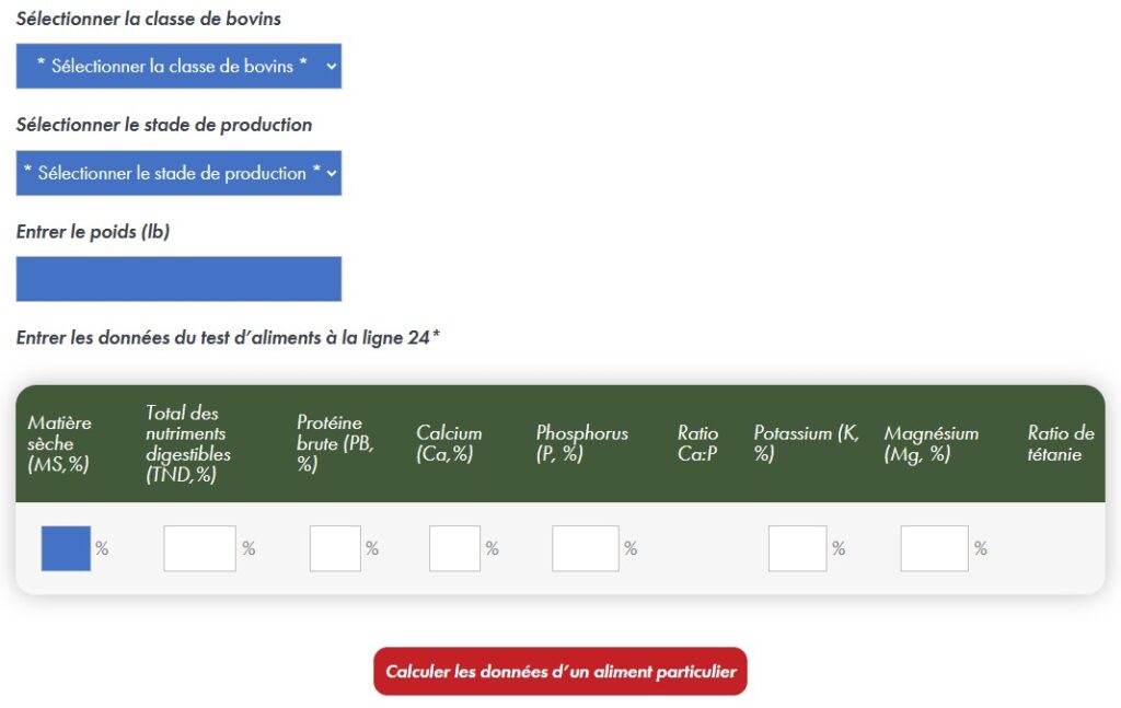 L’outil d’évaluation des résultats des tests d’aliments du BCRC vous permet de saisir certaines de ces données afin d’évaluer si cet aliment répondra aux besoins nutritionnels de base de certaines catégories de bovins à différents stades de production dans des conditions normales. Les résultats peuvent vous alerter sur des problèmes potentiels liés à certains ingrédients alimentaires ; toutefois, il est recommandé de demander conseil à un nutritionniste qualifié ou d’utiliser le logiciel d’équilibrage des rations CowBytes pour élaborer une ration équilibrée pour toutes les catégories de bovins ou pour évaluer les ingrédients lors de l’engraissement des veaux et du développement des génisses.