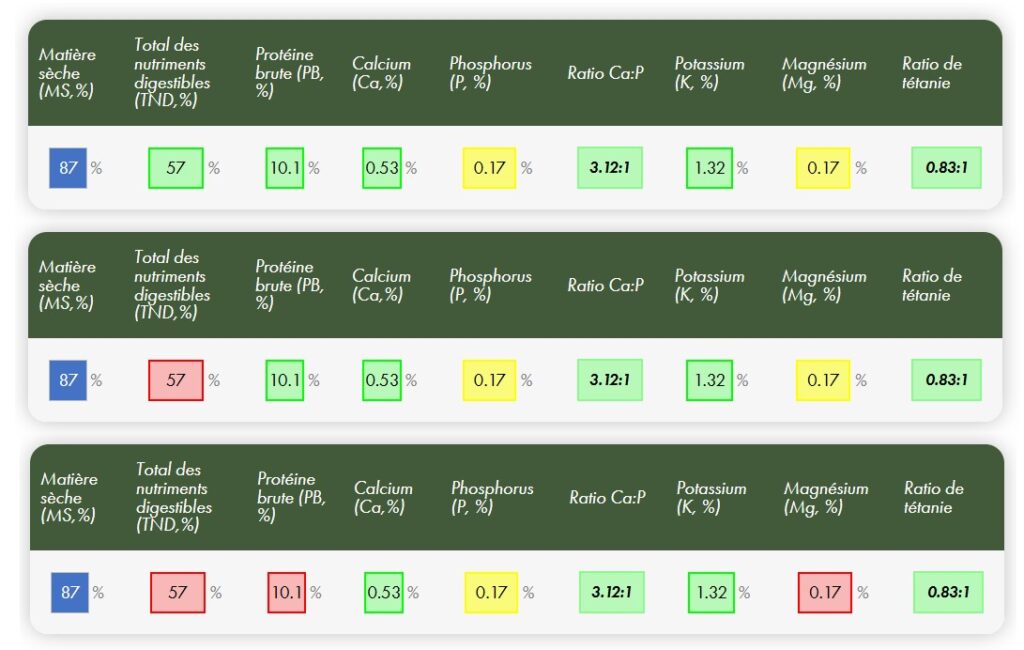- Rouge indique que l’aliment ne répond pas aux besoins des animaux.