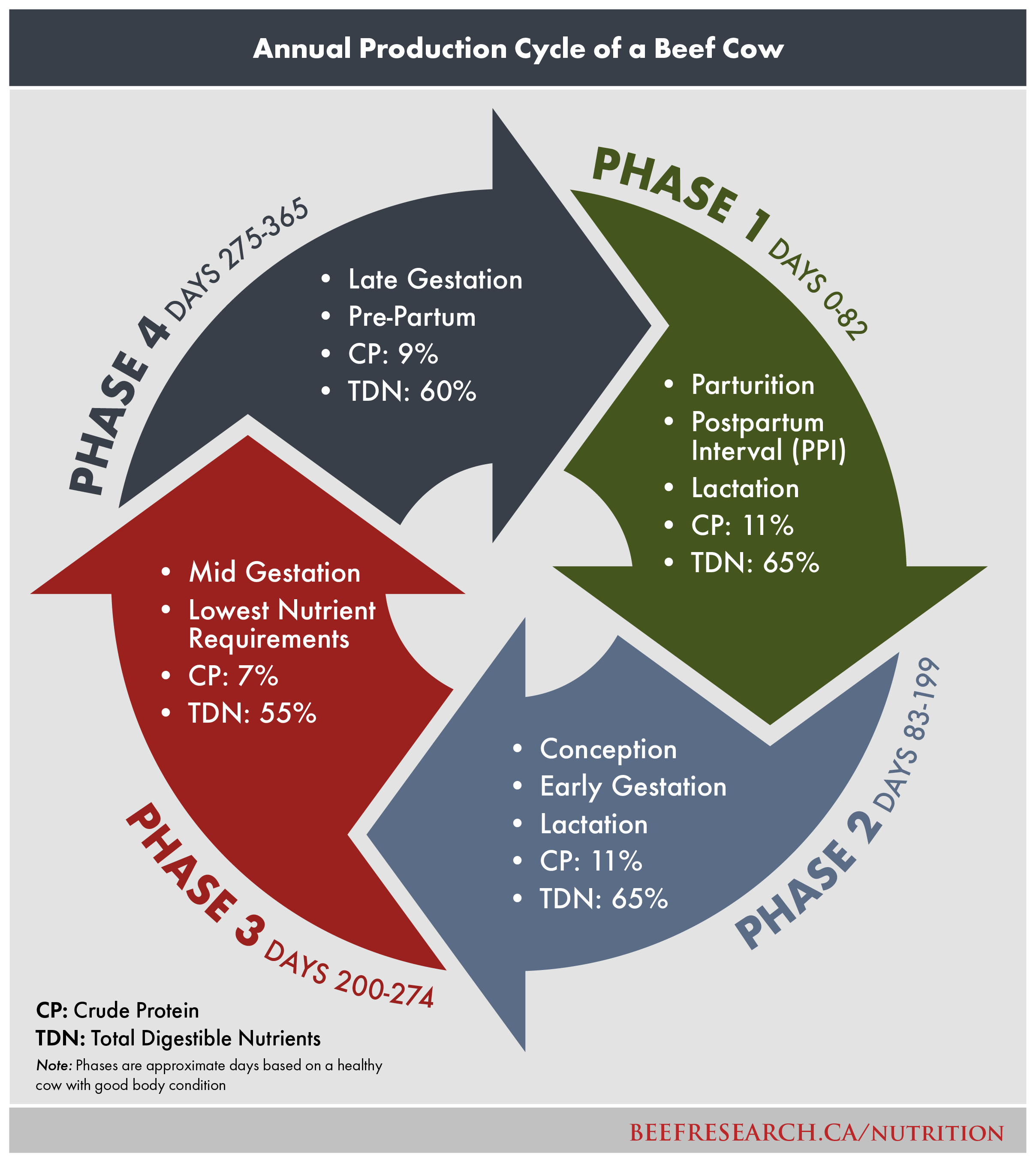 Les besoins nutritionnels des bovins de boucherie sont influencés par le stade de production. Ce cycle de production, basé sur une vache bien gérée, en bonne santé et en bon état (note d’état corporel = 3), maximise la rentabilité en produisant un veau tous les 365 jours. Le cycle de production annuel, basé sur la durée idéale de chaque phase, comprend :