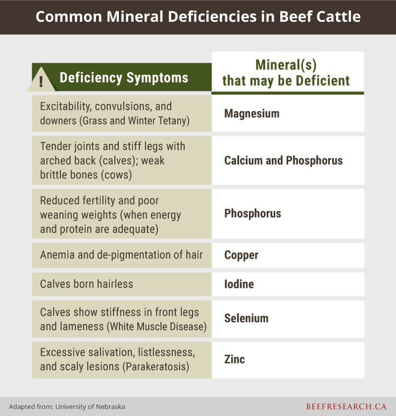Les producteurs doivent surveiller les animaux pour détecter les signes de carence ou de toxicité potentielle, et travailler avec leur vétérinaire et leur nutritionniste pour s’assurer que les niveaux sont adéquats et pour corriger les problèmes éventuels. La toxicité des minéraux peut se manifester par une diminution des performances de l’animal, une anorexie, une perte de poids et des diarrhées. Il peut entraîner des calculs urinaires dus à un excès de phosphore ou à un ratio calcium/phosphore inadéquat, une tétanie d’herbage due à un excès de potassium entraînant une réduction de l’absorption du magnésium, et une polioencéphalomalacie due à un excès de soufre. Certains minéraux, comme le cuivre, peuvent se lier à d’autres minéraux présents dans les aliments et l’eau. Dans ce cas, le minéral ne sera pas disponible pour les bovins en quantités nécessaires. Si les producteurs utilisent des tests d’alimentation pour équilibrer les besoins en minéraux, les animaux peuvent encore être déficients en raison d’une biodisponibilité réduite.