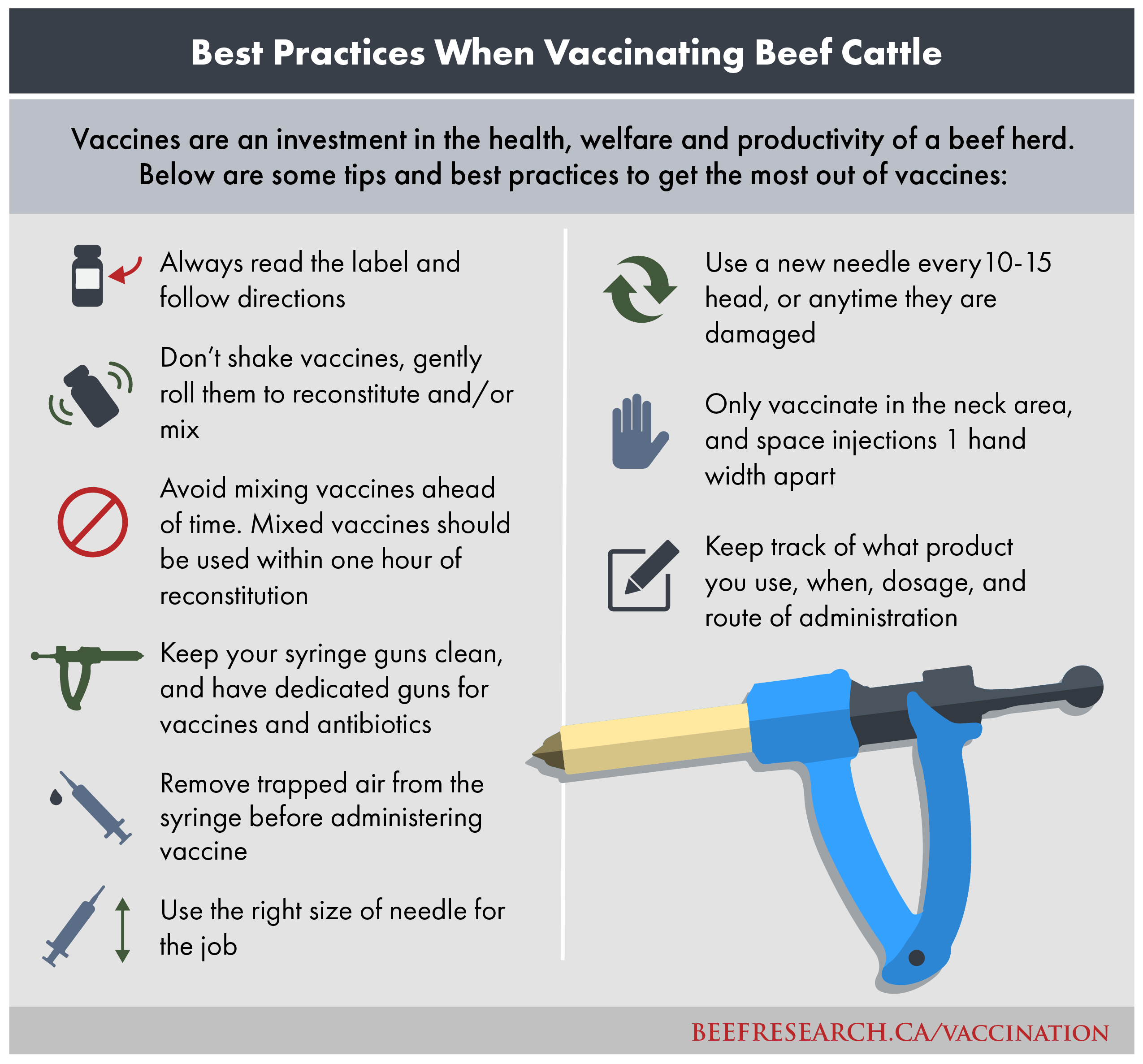 - Change needles often – every 10 animals when vaccinating mature animals, and every time for sick animals. Reusing needles can transmit infections like Anaplasmosis or Bovine Leukemia Virus from animal to animal. Keep a full box of needles on hand.