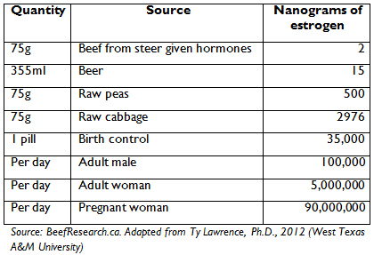 Pour mettre ces niveaux en perspective, considérez les niveaux d’œstrogènes présents naturellement dans toutes les plantes et tous les animaux, y compris les humains. Ce tableau montre qu’une personne devrait manger chaque jour 3 millions de hamburgers provenant de bovins auxquels on a administré des hormones de croissance avant d’être exposée à une quantité d’œstrogènes équivalente à celle produite quotidiennement par une femme moyenne.