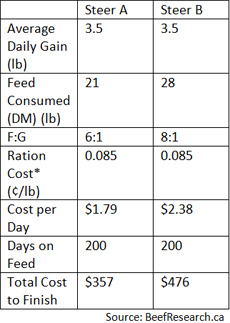 Imaginez deux veaux d’engraissement. Les deux veaux prennent en moyenne 3,5 livres par jour (1,59 kg/jour). Après un certain temps, nous mesurons que le veau A consomme en moyenne 21 lb (9,53 kg) de MS par jour, ce qui équivaut à un indice de consommation de 6:1. Le veau B consomme 28 lb/jour (12,70 kg/jour), soit un indice de consommation de 8:1 et par conséquent, il a une efficacité alimentaire inférieure au veau A. Basé sur des coûts de ration de 187$/tonne* (ou 0,085$ cents par livre), il coûte 1,79$ par jour pour nourrir le veau A. Le veau B coûte 2,38$ par jour. Si les deux veaux atteignent leur poids d’engraissement en 200 jours, l’animal ayant une efficacité alimentaire inférieure (veau B) coûterait 119$ de plus pour le producteur comparativement à un animal avec une meilleure efficacité alimentaire (veau A). (*Remarque : cet exemple pourrait ne pas refléter les coûts alimentaires actuels)
