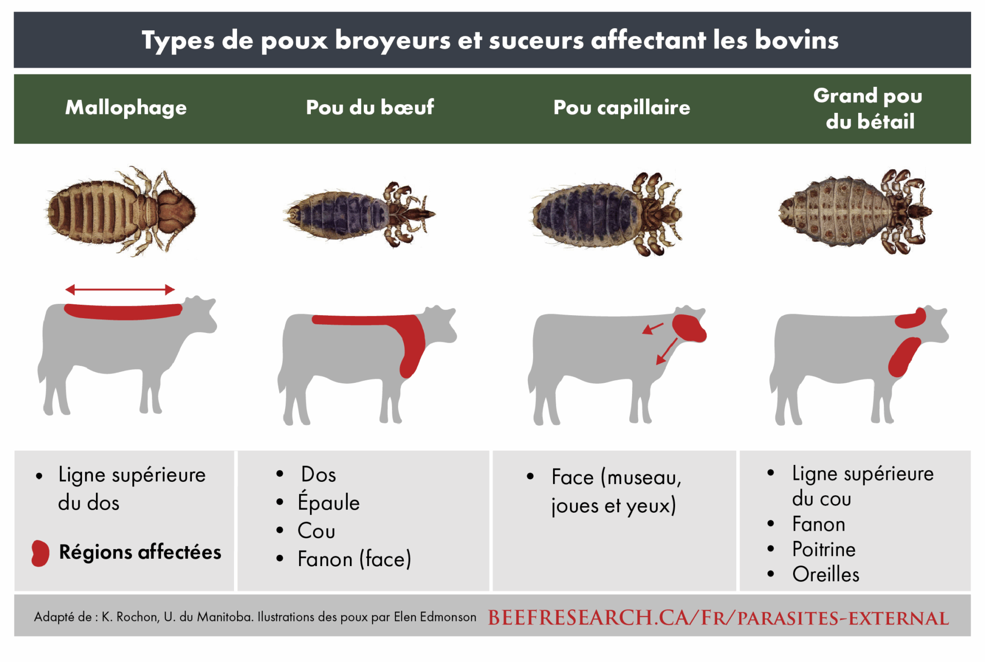 Il existe deux types de poux qui affectent les bovins de boucherie, les poux broyeurs et les poux suceurs. Les poux broyeurs (aussi appelés parfois poux broyeurs) se nourrissent de cellules mortes de la peau et de sécrétions d’huile. Les poux broyeurs peuvent survivre hors de l’animal hôte plus longtemps que les poux suceurs, ce qui peut entraîner l’accumulation d’infestations malgré le traitement. On les trouve souvent sur la ligne du dessus et le flanc des animaux atteints. Le pou du bétail est la seule espèce de poux broyeurs qui affecte le bétail canadien.