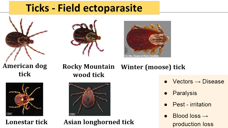 Les pâturages et le bétail aux pâturages peuvent être affectés par les tiques. Au Canada, trois principales espèces de tiques peuvent infester les bovins, notamment la tique américaine du chien, la tique des bois des Rocheuses et la tique de l’orignal (hivernale). Ces espèces de tiques sont également toutes des vecteurs de transmission de maladies humaines telles que la fièvre pourprée des montagnes Rocheuses. Les tiques peuvent également véhiculer et transmettre des maladies du bétail, telles que l’anaplasmose bovine, d’un animal à un autre. De plus, certaines populations de la tique des Rocheuses peuvent causer la paralysie du bétail dans certaines parties de la Colombie-Britannique en raison d’une neurotoxine libérée par les pièces buccales de la tique.