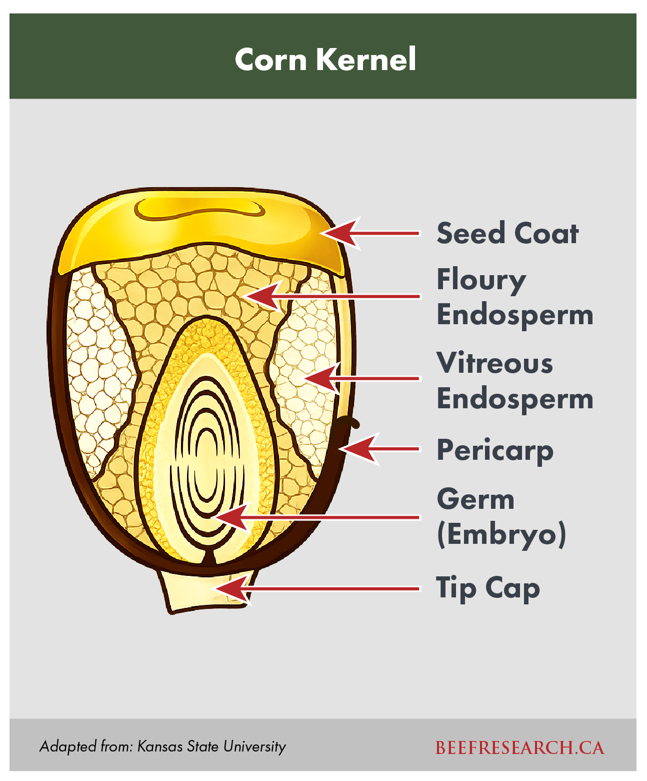 Corn can be classified as dent or flint types. Dent corn is the principle type grown for livestock feed. Dent corn is typically yellow in color. The interior of the kernel is characterized by an endosperm that is soft and floury on the inside and harder and denser (vitreous) on the outside4, 5. The endosperm contains most of the starch, which in the case of dent varieties is relatively digestible, particularly that found in the inner floury endosperm. The harder vitreous endosperm also contains protein that forms a protective matrix with the densely packed starch granules5. A seed coat or pericarp surrounds the endosperm. At maturity, the cap of the dent kernel is dented, hence the classification.