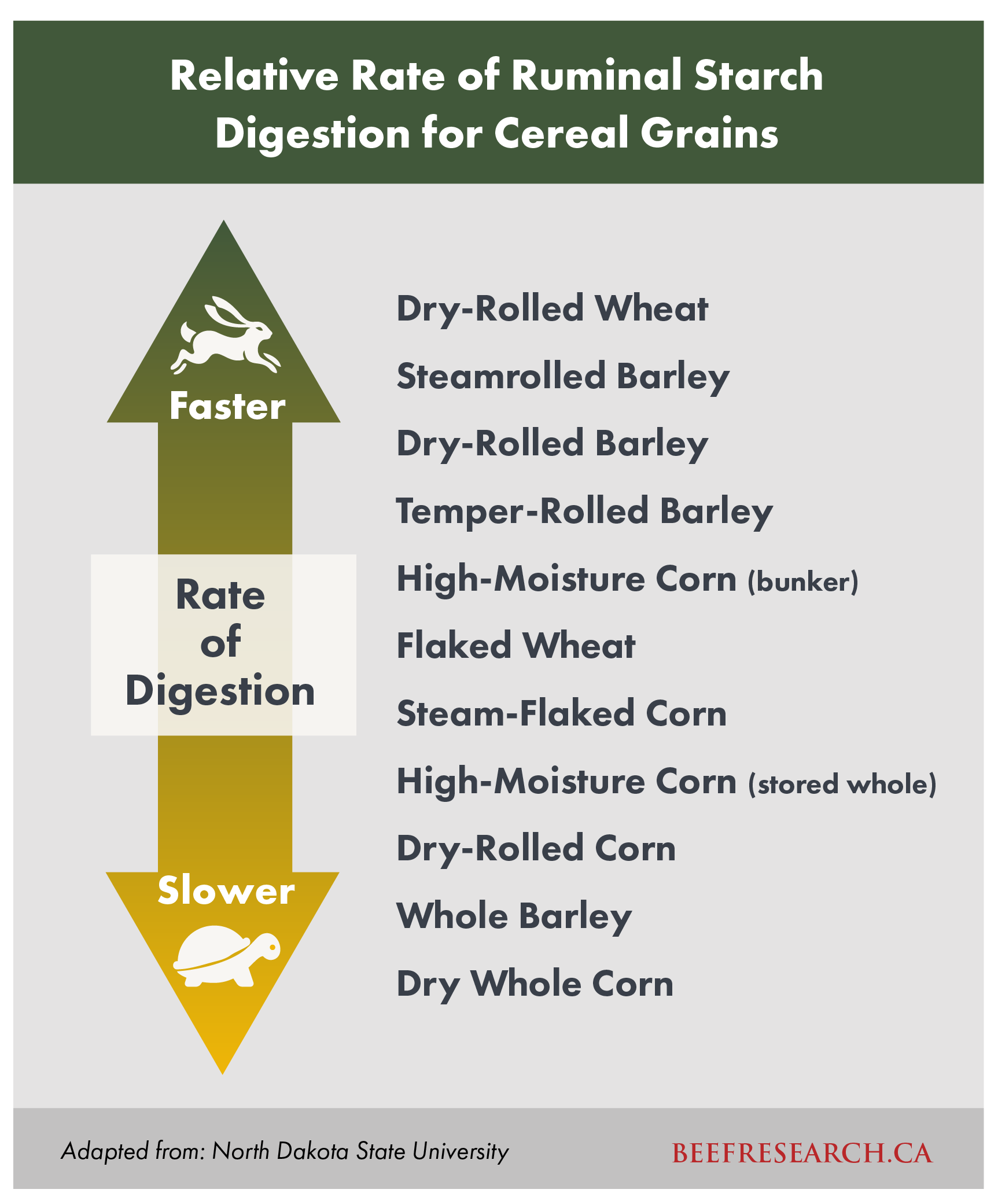 Cereal grains are used extensively by the Canadian beef industry, primarily as sources of energy. In terms of ranking, corn and wheat are superior energy sources for cattle, followed by barley and oat grain, respectively. Differences in energy content reflect differences in starch content and kernel structure, particularly the presence or absence of an outer hull. Oat grain can be successfully fed whole to growing cattle due to superior chewing ability relative to mature cattle. Barley and wheat require processing to optimize digestibility of starch and other nutrients with dry rolling the method of choice. Corn grain may be fed whole, dry-rolled or steam flaked or as high moisture grain with performance optimized with steam flaked and high moisture grain. With all cereals, rapid rumen fermentation of starch can predispose cattle to issues with rumen acidosis, making feed and bunk management critical components of the overall management program.